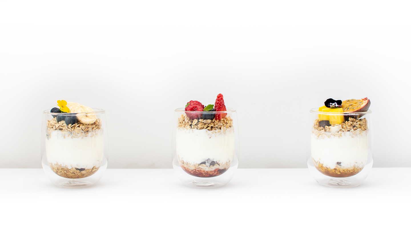 Creamy vanilla yogurt topped with zingy mango puree, fresh cubed mango, passion fruit seeds and crunch raisin nut granola. Served with a drizzle of honey.
