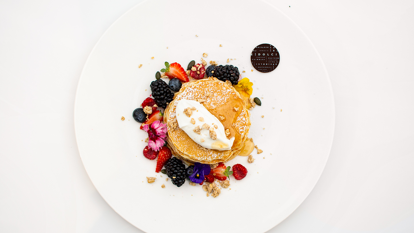 Fresh pancakes loaded with perfectly ripe bananas. Drenched in molten Dolci® milk chocolate sauce. Served with fudge pieces and a scoop of smooth Madagascan vanilla gelato.