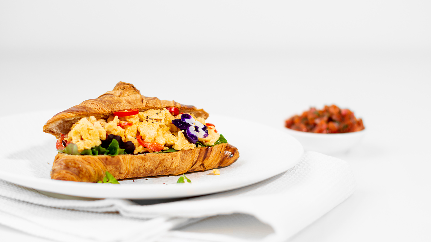 Scrambled eggs with roasted peppers, red onions and fresh chillies blended with cheddar cheese. Served in a flaky croissant with fresh salad