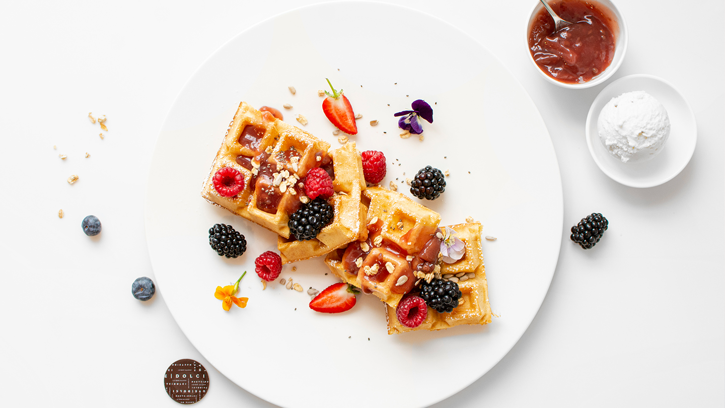 Airy waffle served with silken Dolci® milk chocolate sauce. Warmed to perfectly contrast with exquisite Stracciatella gelato and garnished with milk chocolate curls. Luxurious and utterly delectable.