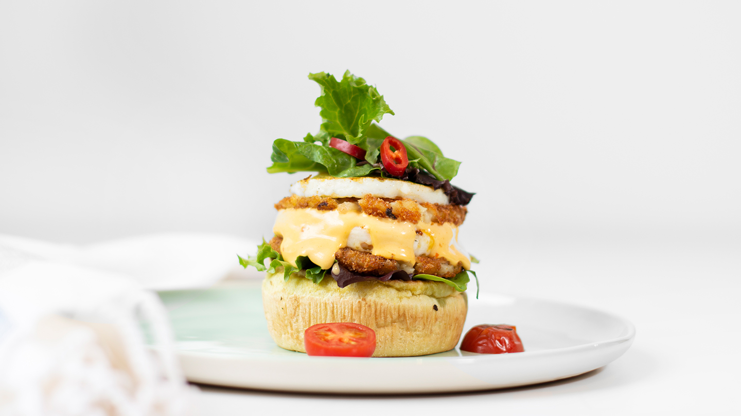 Classic poached eggs on a crispy English muffin, topped with creamy Hollandaise sauce and beef rashers all served on a bed of fresh salad leaves.